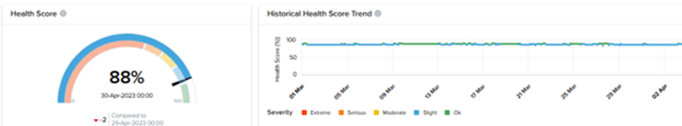 The Health Score (HS) for one hydropower generator was deteriorating over time. In April 2023, the HS reached a low of 88%. After a maintenance event correction, the HS was back up to the historically normal level of 95%. In addition to the vibration trends returning to normal levels, the Health Score also returned to normal. While Health Scores are trendable, they are not intended for proactive machinery diagnostics but are instead useful as a confirming indicator that the correct maintenance or remedial procedure was performed.
