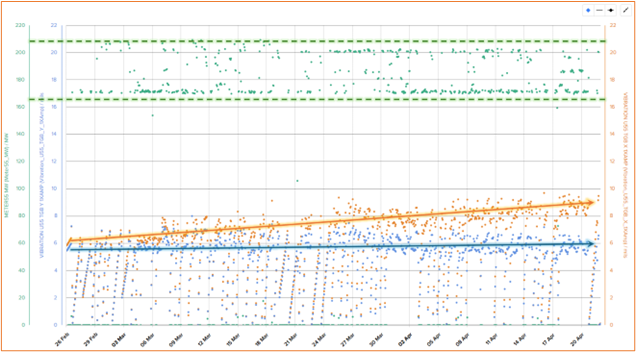 Vibration data from the Alert generated on March 4, 2023, shows the initiation of the defect, shown in the green box below. The vibration anomaly increased the amplitude on one of the vibration probes. For this machine, amplitudes below 6 Mils (0.006 inches displacement, peak-to-peak) are considered good. The Acceptable amplitude region is from 6 to 10 Mils, and High is from 10-20 Mils. In this instance, the levels increased to 7 Mils, which is still in the acceptable region, but there was a definite increase in vibration values over the 6 weeks shown in the first graph. The lower graphs are plotted with the Load parameter included for the defective unit on the left and the other (good) unit on the lower right. We expect the vibration amplitudes to track each other from the two sensors on each machine. Measuring vibration amplitudes using similar loading conditions is an excellent way to increase analysis accuracy. The Health Score for this generator also deteriorated by about 10%, showing the direct correlation between anomaly detection and health scores. The unit was repaired and put back in service.